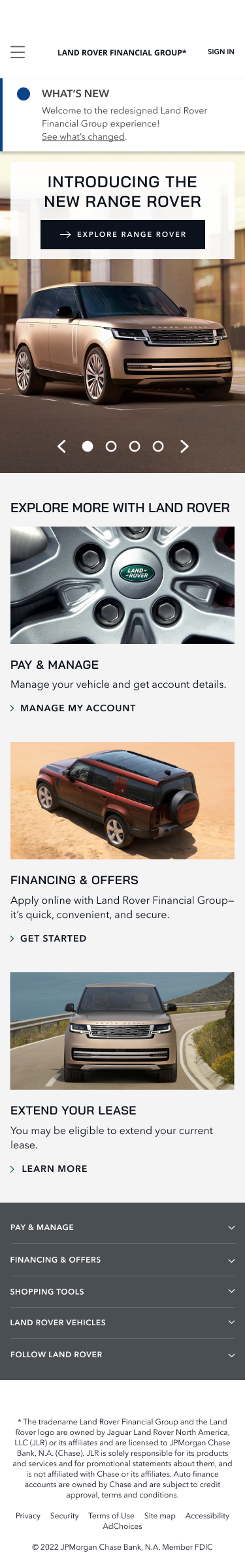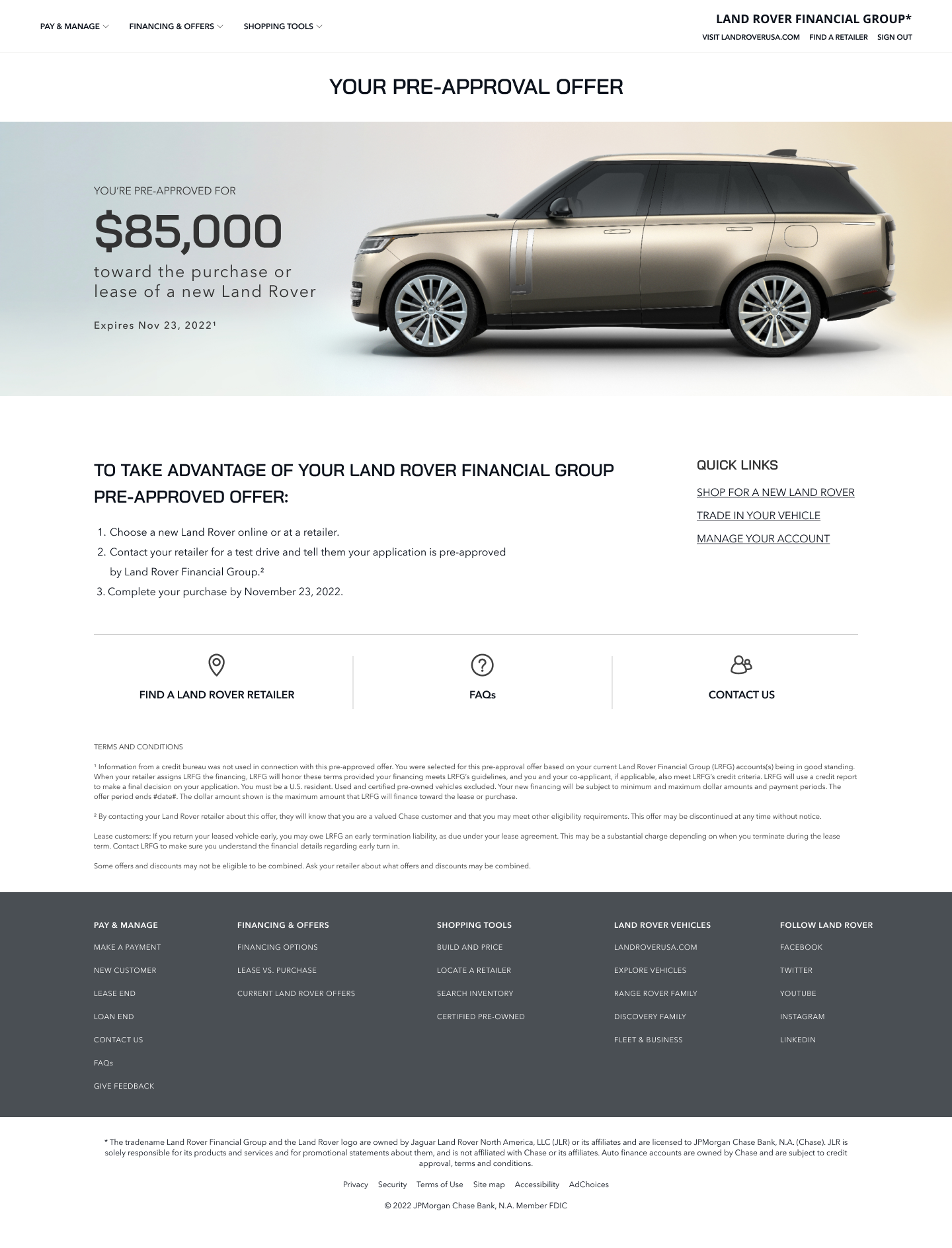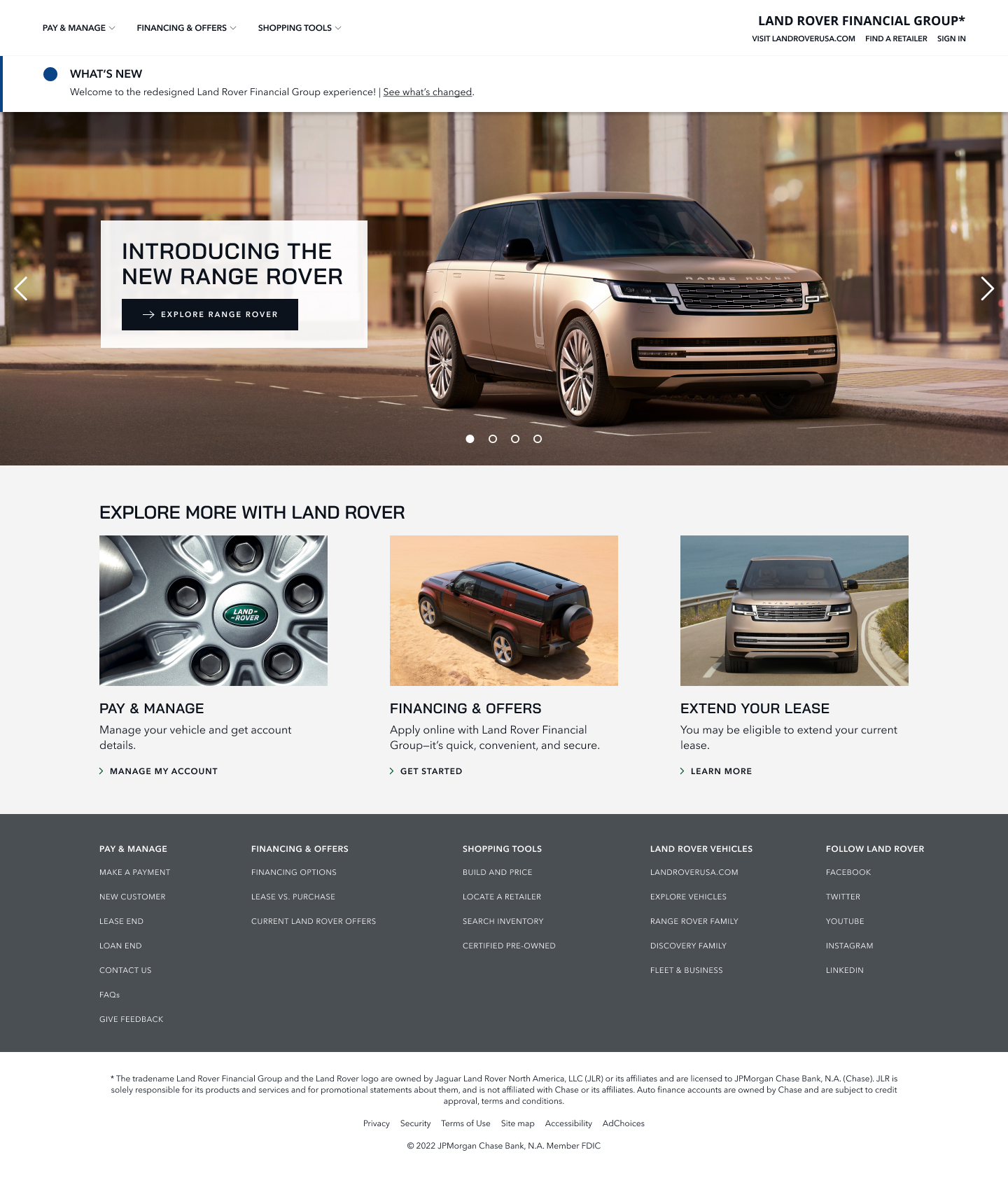 Business Challenge achieve coherence in the user experience by presenting Range Rover Financial Services as a Range Rover- branded site, replacing the Chase co-branded product. Service new lead generation, as well as