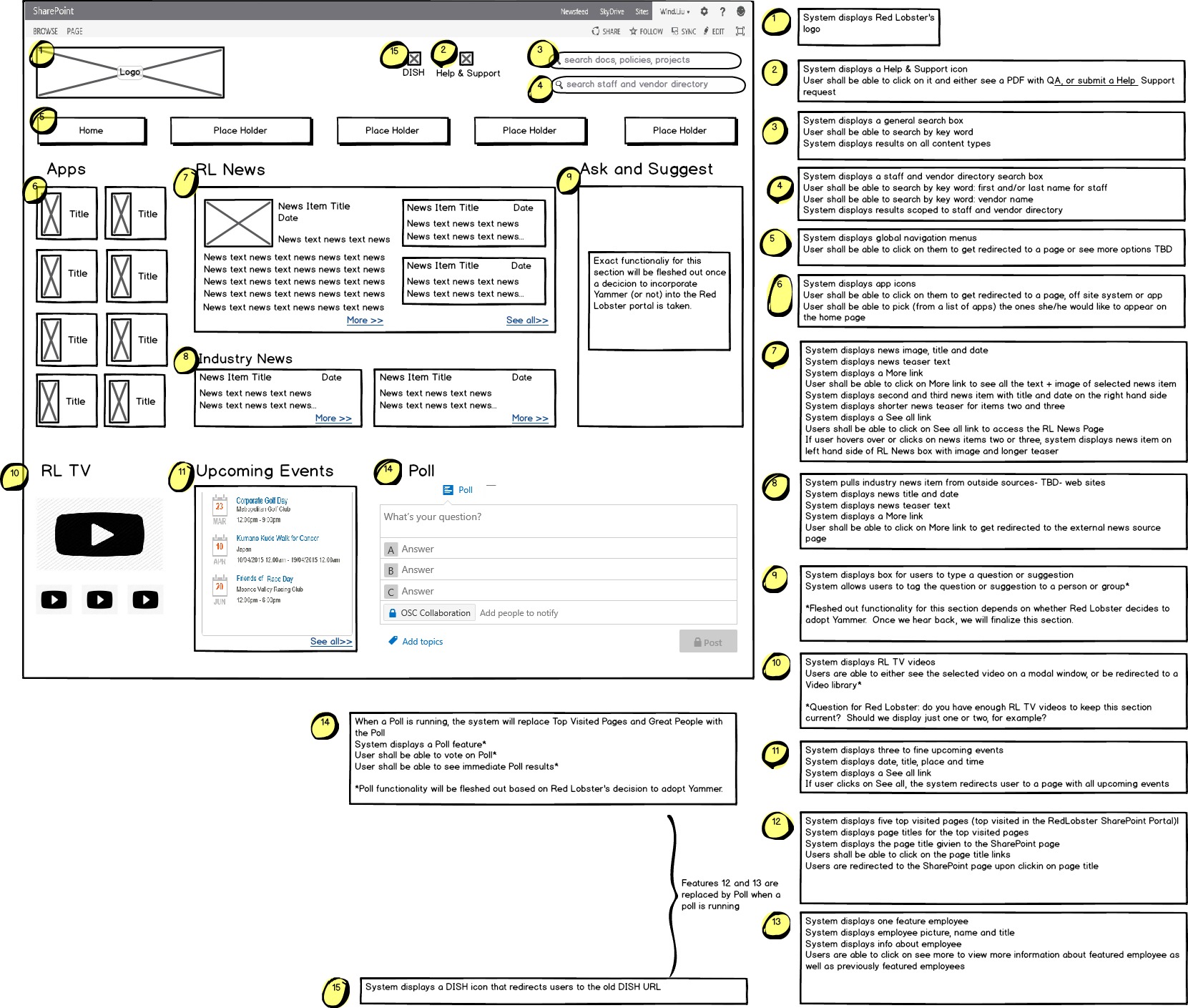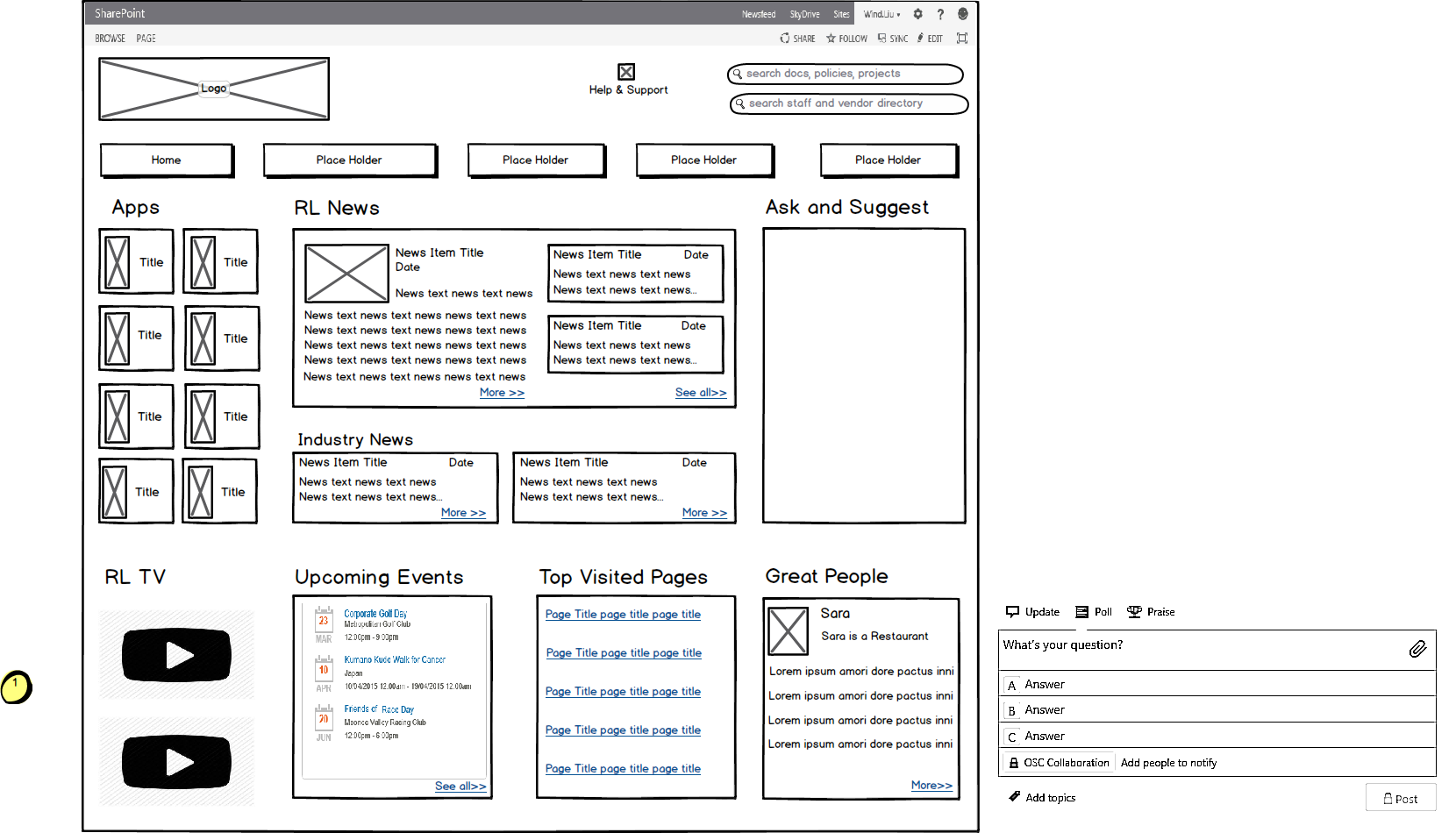 The below wireframe showcases Great People instead of the poll functionality. We built the system, so that admins could easily implement a poll or showcase Great People on the bottom right hand side of the home page.